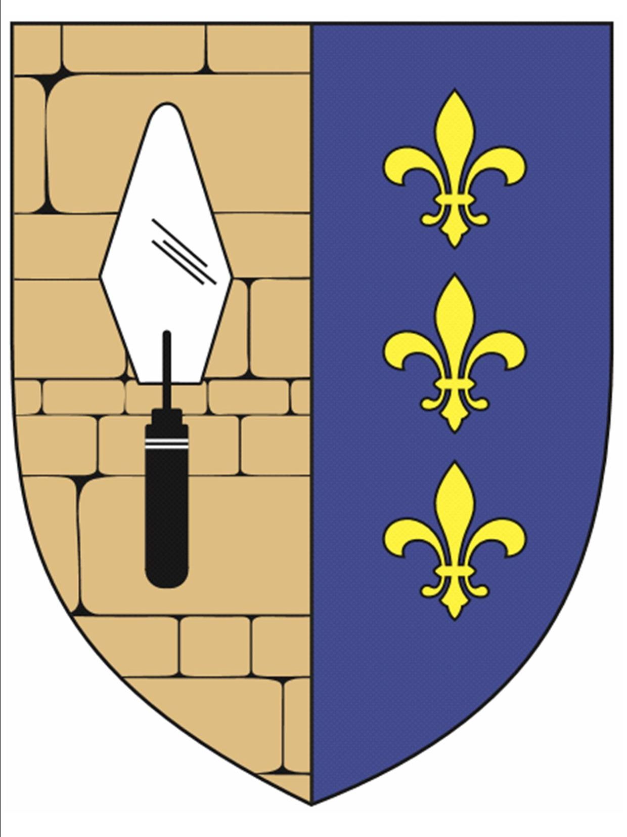 « Parti au premier d'aurore à une truelle d'Argent sur fond de pierre de taille maçonné de Sable, au Second d'Azur chargé de trois fleurs de lys d'Or posées en pal »
